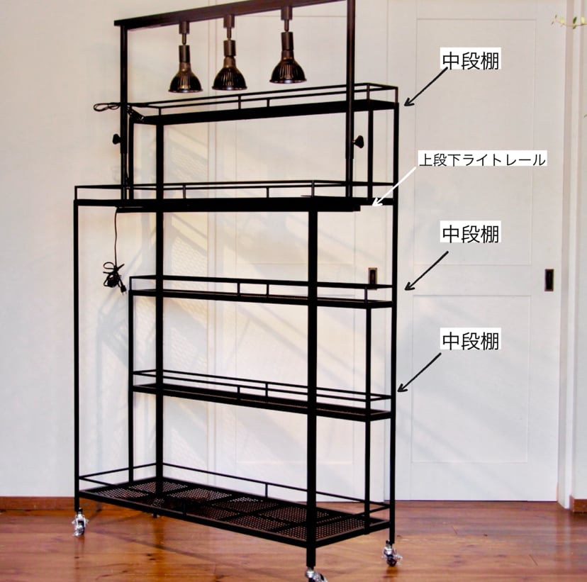 こちらのタイプは2段植物棚にオプションの中段棚を中段に2か所、上段上に1か所、上段下ライトレール1カ所に取り付けております。